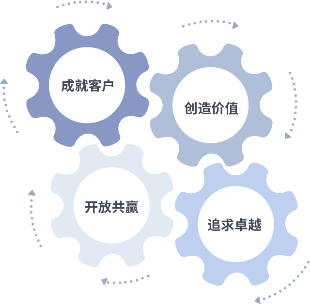 成就客户是一切决策的出发点,创造价值是衡量所有工作的标准,追求卓越是皇家荣耀做事做人的态度,开放共赢是皇家荣耀的格局也是最终的结果。价值观的齿轮环环相扣,推动着组织里的每个人不断向前。